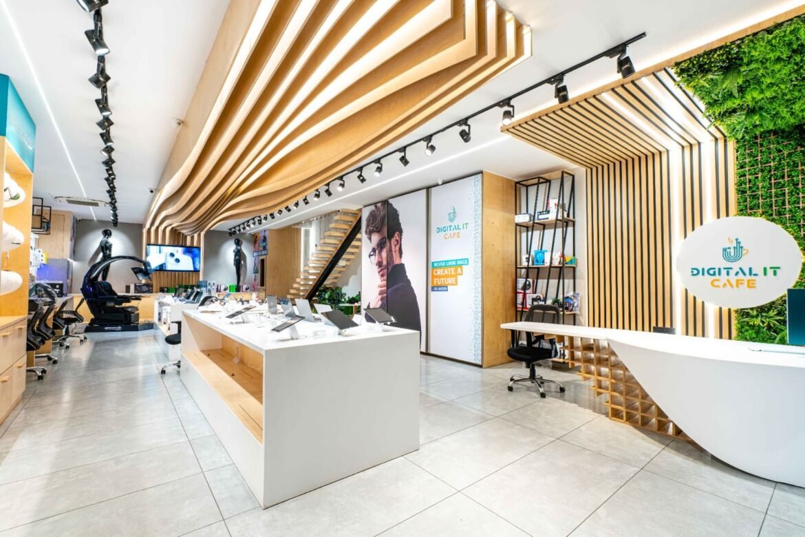 The store’s interior is modern and spacious, with a dedicated area for tech products and a separate area for the cafe. Customers can browse through the latest laptops and mobile phones and then grab a coffee or a snack from the cafe.